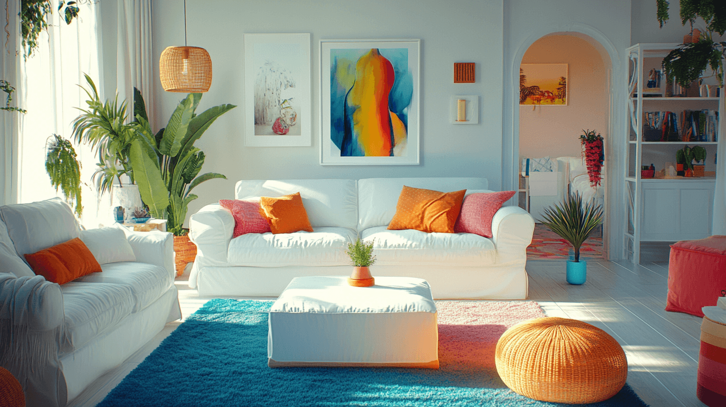 Weiße Möbel in einem farbenfrohen Wohnzimmer können als neutraler Ankerpunkt dienen und helfen, das visuelle Gleichgewicht im Raum zu wahren. Um zu verhindern, dass der Raum überladen wirkt, ist es wichtig, die weißen Möbelstücke geschickt zu platzieren. Ein weißes Sofa oder ein Couchtisch kann zum Beispiel vor einer farbigen Wand positioniert werden, um einen deutlichen Kontrast zu erzeugen. Achte darauf, dass die weißen Möbel nicht von den bunten Elementen dominiert werden, indem du sie mit passenden Accessoires ergänzt. Bunte Kissen, Decken oder Teppiche, die die Farben der Wände widerspiegeln, können dazu beitragen, ein stimmiges Gesamtbild zu schaffen. Auch die Materialwahl ist entscheidend: Weiße Möbel aus Holz bringen eine warme Atmosphäre in den Raum, während Möbel aus Metall oder Kunststoff einen modernen Akzent setzen. Probiere verschiedene Möbelanordnungen aus, um die optimale Balance zwischen Farbe und Neutralität zu erreichen.
