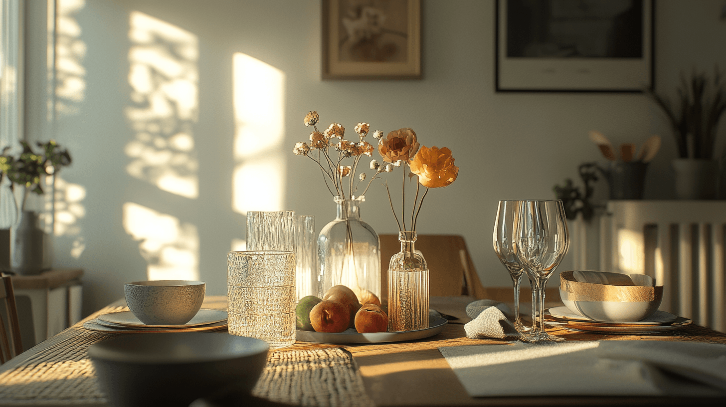 Tischdekorationen wie Vasen, Kerzenständer oder eine Schale mit frischem Obst können den Essbereich aufwerten. Achte darauf, dass die Dekoration nicht zu überladen wirkt, um den Raum nicht zu erdrücken. Weniger ist oft mehr, besonders in kleineren Küchen.