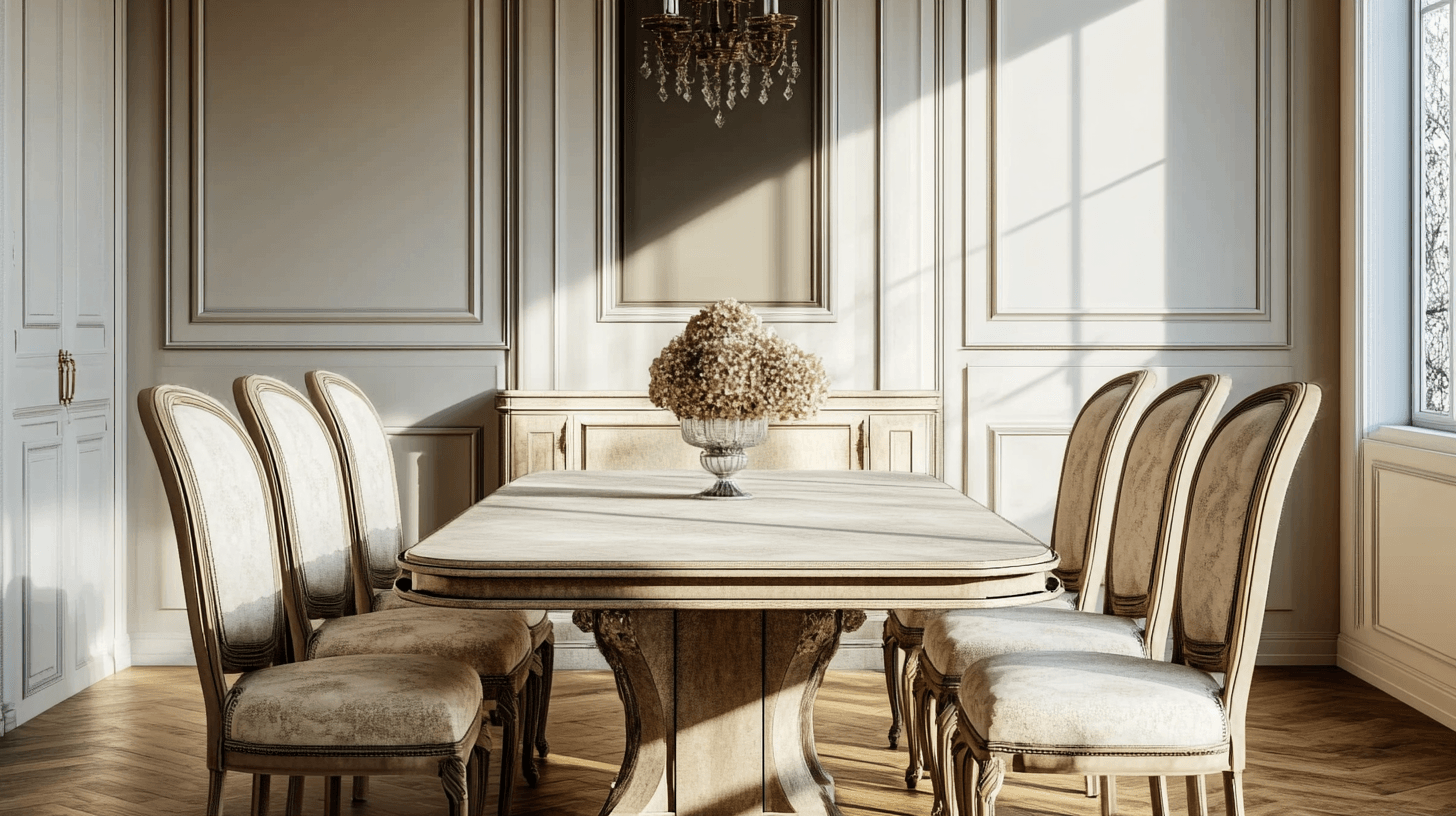 Um ein klassisches Esszimmer zu gestalten, ist die Auswahl der passenden Möbel von großer Bedeutung. Starte mit dem zentralen Element des Raumes: dem Esstisch. Ein großer Tisch aus Eichen-, Mahagoni- oder Walnussholz schafft eine warme und einladende Atmosphäre. Achte darauf, dass der Tisch stabil und gut verarbeitet ist, um eine lange Lebensdauer zu sichern. Runde oder ovale Tische sind ideal für kleinere Räume, während rechteckige Tische in größeren Esszimmern besser zur Geltung kommen.